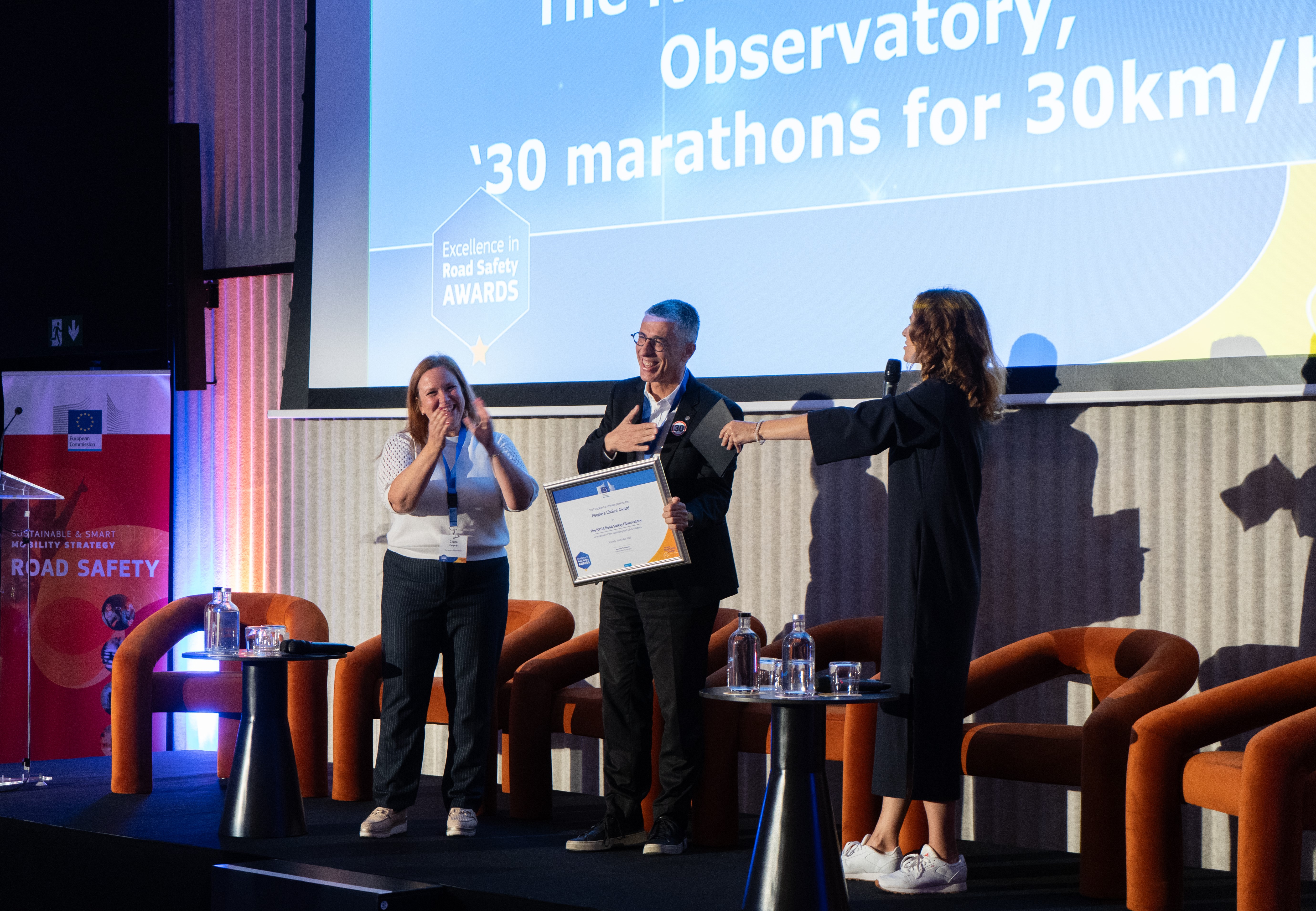 The NTUA Road Safety Observatory won the Excellence in Road Safety Award of the the European Commission – People’s Choice – on 16 October 2025 in Brussels, in recognition for the great impact of the NRSO Campaign promoting 30km/h city-wide speed limits as the key policy for safer, healthier and greener cities. NTUA Prof. George Yannis mentioned that “Robust scientific evidence demonstrates that slower traffic can save thousands of lives in Europe, especially those of pedestrians, cyclists and motorcyclists and at NTUA we are excited to contribute with all our efforts and with our 30 Marathons campaign and see more and more cities and countries in Europe adopting the 30km/h city-wide speed limits“.