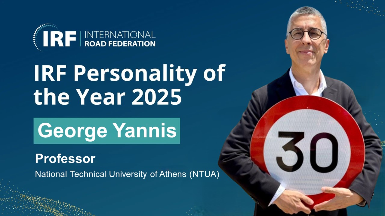 The International Road Federation (IRF) has honoured Professor George Yannis with the IRF Personality of the Year Award 2025, recognising his exceptional leadership, scientific contribution and global impact in advancing road safety and sustainable mobility. His academic influence is reflected in a remarkable publication record of over 1,000 scientific papers, widely cited around the world, and contribution in more than 350 research and engineering projects. Beyond academia and institutional leadership, Professor Yannis has also demonstrated an inspiring personal commitment to safer cities. In November 2024, he completed an extraordinary challenge: running 30 Marathons in 30 months to promote the adoption of city-wide 30 km/h speed limits. By awarding Professor Yannis the Personality of the Year 2025, the IRF celebrates not only a distinguished professional career, but a lifelong dedication to making mobility safer for all, through science, advocacy and personal action.