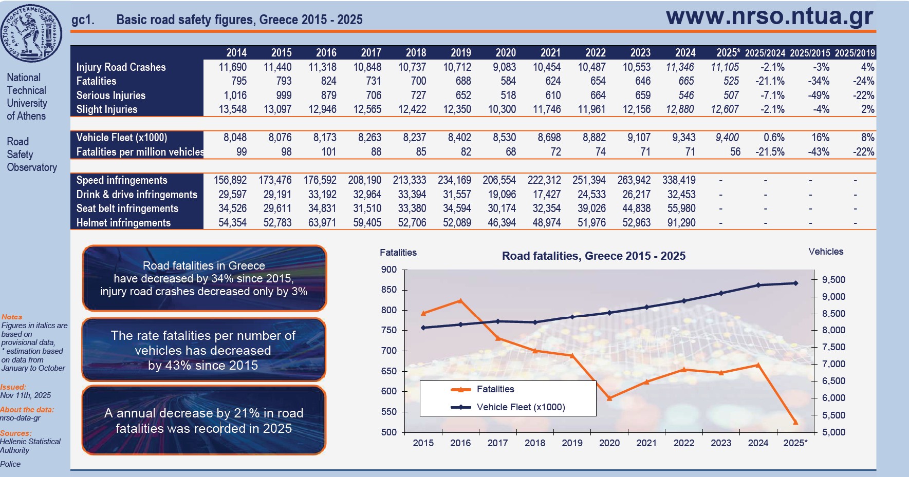 Road fatalities in Greece in 2025 presented a significant decrease (21.1%) compared to 2024 figures, according to the provisional ELSTAT and Traffic Police data. This is the result of the intensification of enforcement of helmet wearing and drink-and-drive by the Police together with the new Road Traffic Code in Greece (voted in June and in force since September) which led to an astonishing improvement of driver behaviour and consequently to this very significant reduction or road crash fatalities.