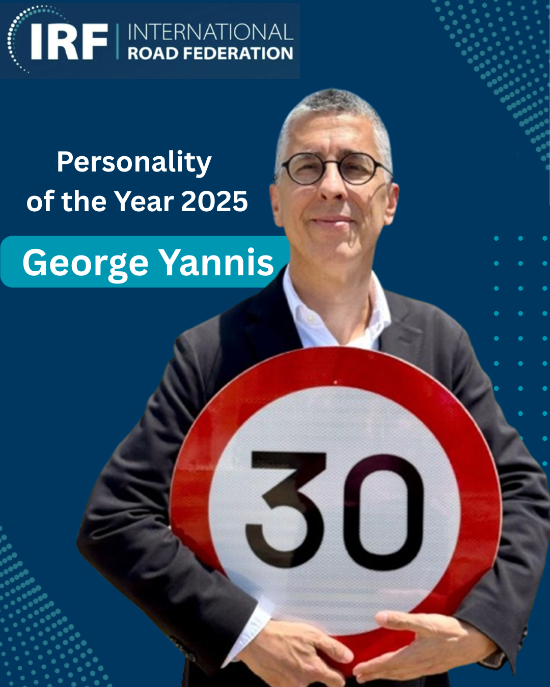 The International Road Federation (IRF) has honoured Professor George Yannis with the IRF Personality of the Year Award 2025, recognising his exceptional leadership, scientific contribution and global impact in advancing road safety and sustainable mobility. His academic influence is reflected in a remarkable publication record of over 1,000 scientific papers, widely cited around the world, and contribution in more than 350 research and engineering projects. Beyond academia and institutional leadership, Professor Yannis has also demonstrated an inspiring personal commitment to safer cities. In November 2024, he completed an extraordinary challenge: running 30 Marathons in 30 months to promote the adoption of city-wide 30 km/h speed limits. By awarding Professor Yannis the Personality of the Year 2025, the IRF celebrates not only a distinguished professional career, but a lifelong dedication to making mobility safer for all, through science, advocacy and personal action. ![]()