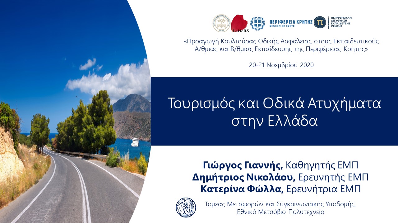 “Tourism and Road Accidents in Greece” at Road Safety Culture, Yesterday-Today-Tomorrow, organised by LaHeRS (20-21 November 2020). ID cp438 Presentation Tags accident analysis