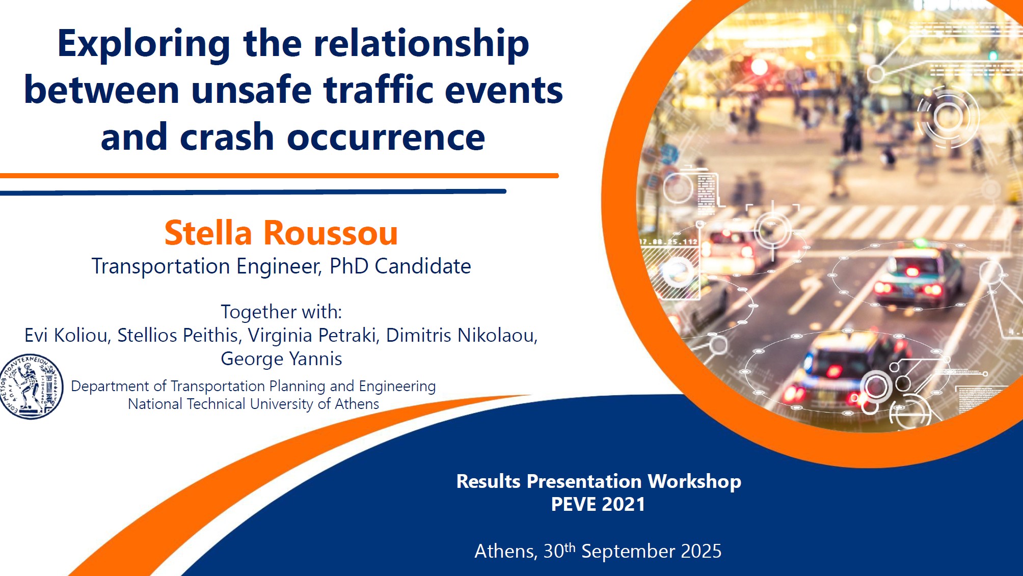 “Exploring the relationship between unsafe traffic events and crash occurrence”, at the Results Presentation Workshop PEVE2021 organized by NTUA (Athens, 30 September 2025) ID cp751 Presentation Tags