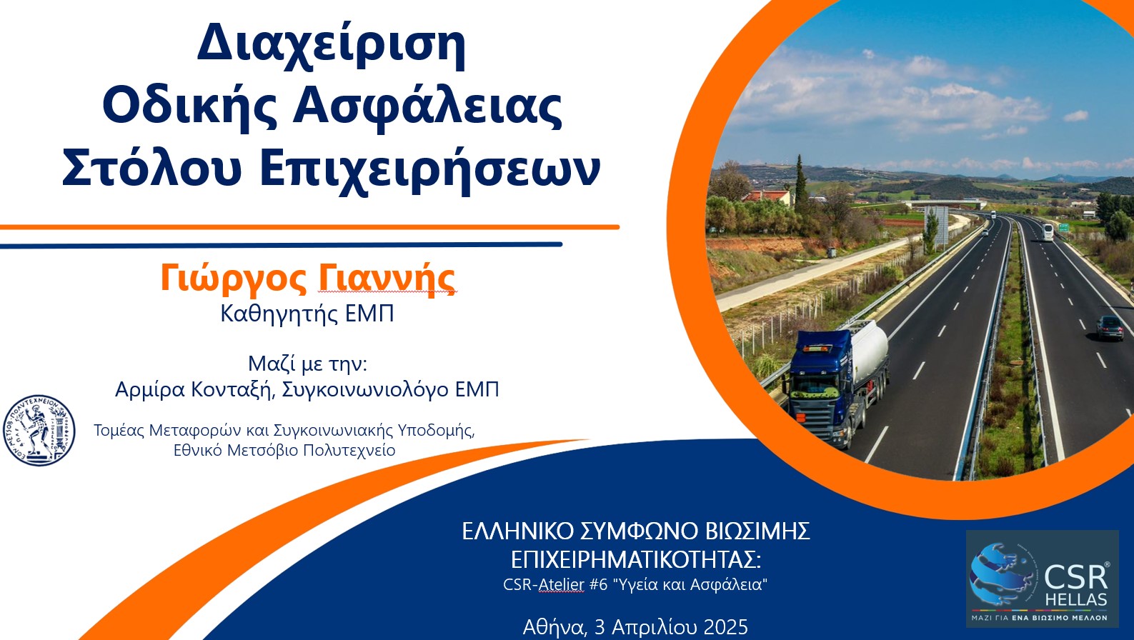 “ΔιαχείρισηΟδικής Ασφάλειας Στόλου Επιχειρήσεων”, στο Ελληνικό Σύμφωνο Βιώσιμης Επιχειρηματικότητας: CSR-atelier#6 “Υγεία και Ασφάλεια” από την CRS Hellas (Αθήνα, 3 Απριλίου 2025). ID cp697 Presentation Tags