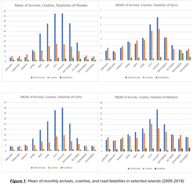 This paper analyzes road crashes on 38 Greek islands to assess the impact of tourism on road safety. Monthly data on tourist arrivals, crashes, and fatalities were collected and grouped by geographical region. Initial insights were drawn by creating charts for four representative islands, highlighting correlations between arrivals and both crashes and fatalities. To further explore these relationships, Generalized Linear Models and Random Forest models were developed using R. The analysis revealed a positive correlation between tourist arrivals and road crashes, indicating that higher visitor volumes often coincide with increased crash and fatality rates. However, the strength of this relationship varied across island groups, potentially reflecting differences in road infrastructure and traffic management. Notably, some high-traffic islands exhibited lower crash rates, suggesting that better road conditions or more effective traffic control measures may mitigate the impact of tourism on road safety.